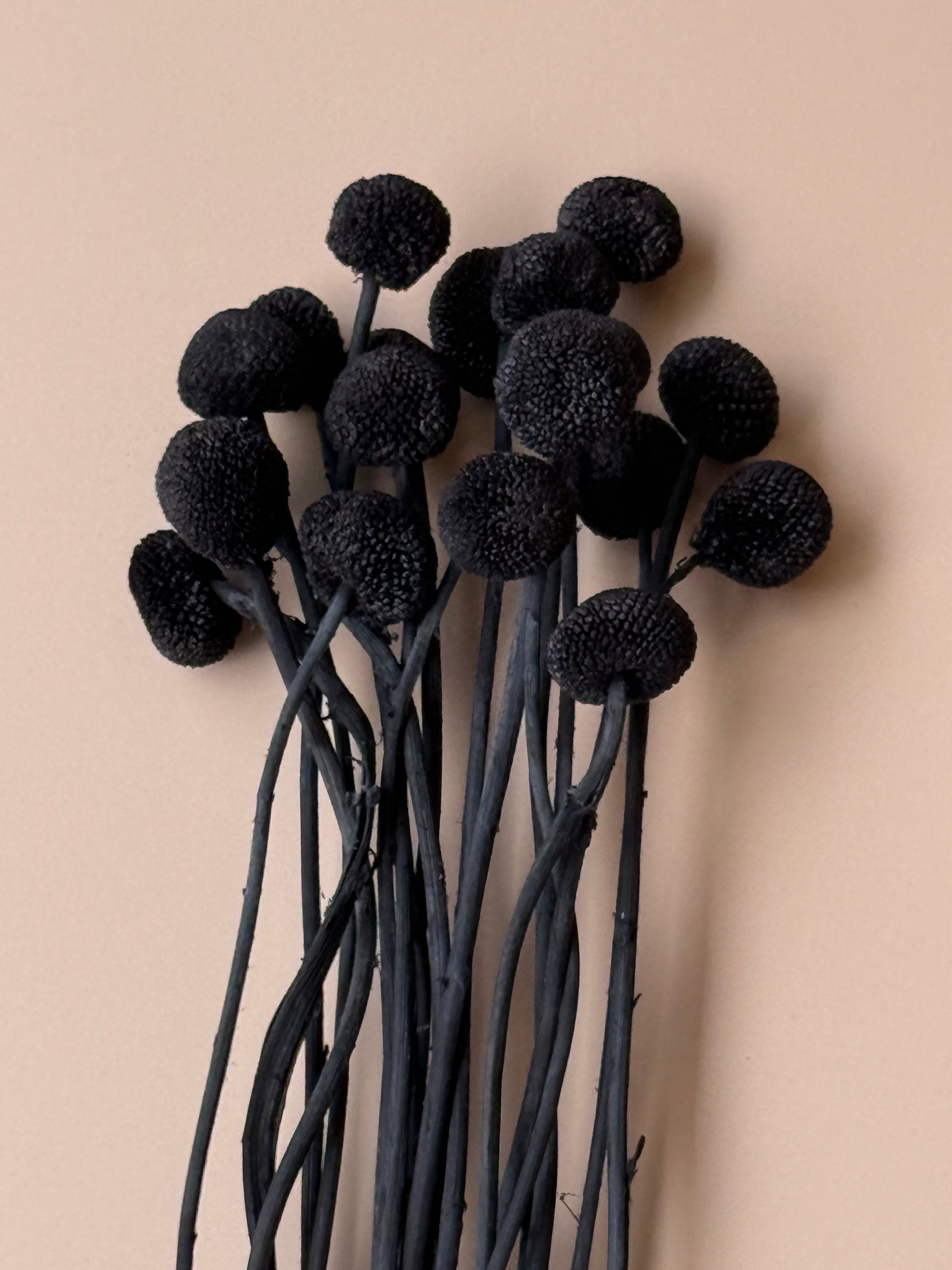 Cute but moody black/chalk black (grey undertones on some) Craspedia also known as billy balls. Not all are perfectly round as these are natural product that has been preserved to last. Fun and unique to look at in a vase or bouquet.